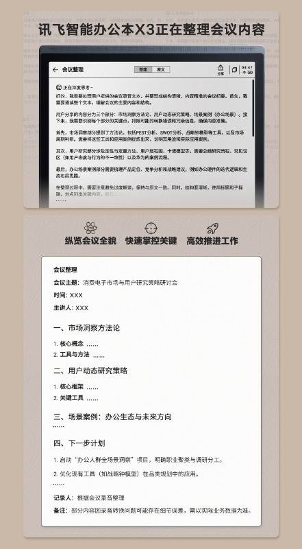 此次接入DeepSeek后,讯飞智能办公本X3的会议整理能力得到了进一步提升。在讯飞星火和DeepSeek的双引擎加持下,它能够迅速从海量会议信息中提取关键内容,帮助商务人士高效决策。新上线的“会议整理”功能,更是将自动记录的会议内容进行了提纯,通过“金字塔结构”模块化展示,使得会议重点一目了然。