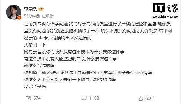 李荣浩在微博上表达了对此事的不满和困惑。他指出,在新专辑发布前,团队已经对专辑质量进行了严格把控,甚至在发货前随机抽取了十本专辑进行检查,以确保没有质量问题。然而,尽管如此谨慎,网易云音乐的NFC卡片链接仍然出现了错误。