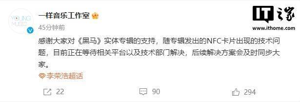 面对李荣浩的质疑,网易云音乐尚未直接回应。不过,一样音乐工作室代表李荣浩方面发表了声明,感谢大家对《黑马》实体专辑的支持,并表示目前正在等待相关平台和技术部门解决NFC卡片的技术问题。工作室承诺,后续会及时公布解决方案,并妥善处理已购买专辑的消费者问题。