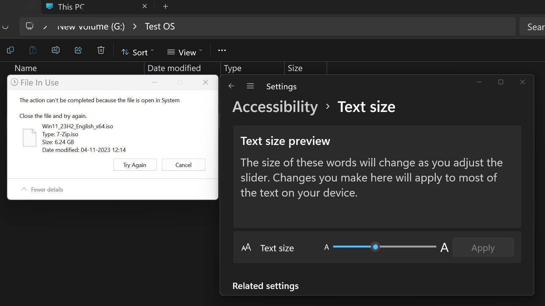 然而,在最新的更新中,微软解决了这一问题。Windows Latest再次进行了测试,将文本大小设置为150%,并通过强制删除挂载的ISO文件触发错误窗口。这次,对话框内的所有文本,包括内容和按钮文本,都按照新的设置进行了放大,呈现出一致性和协调性。