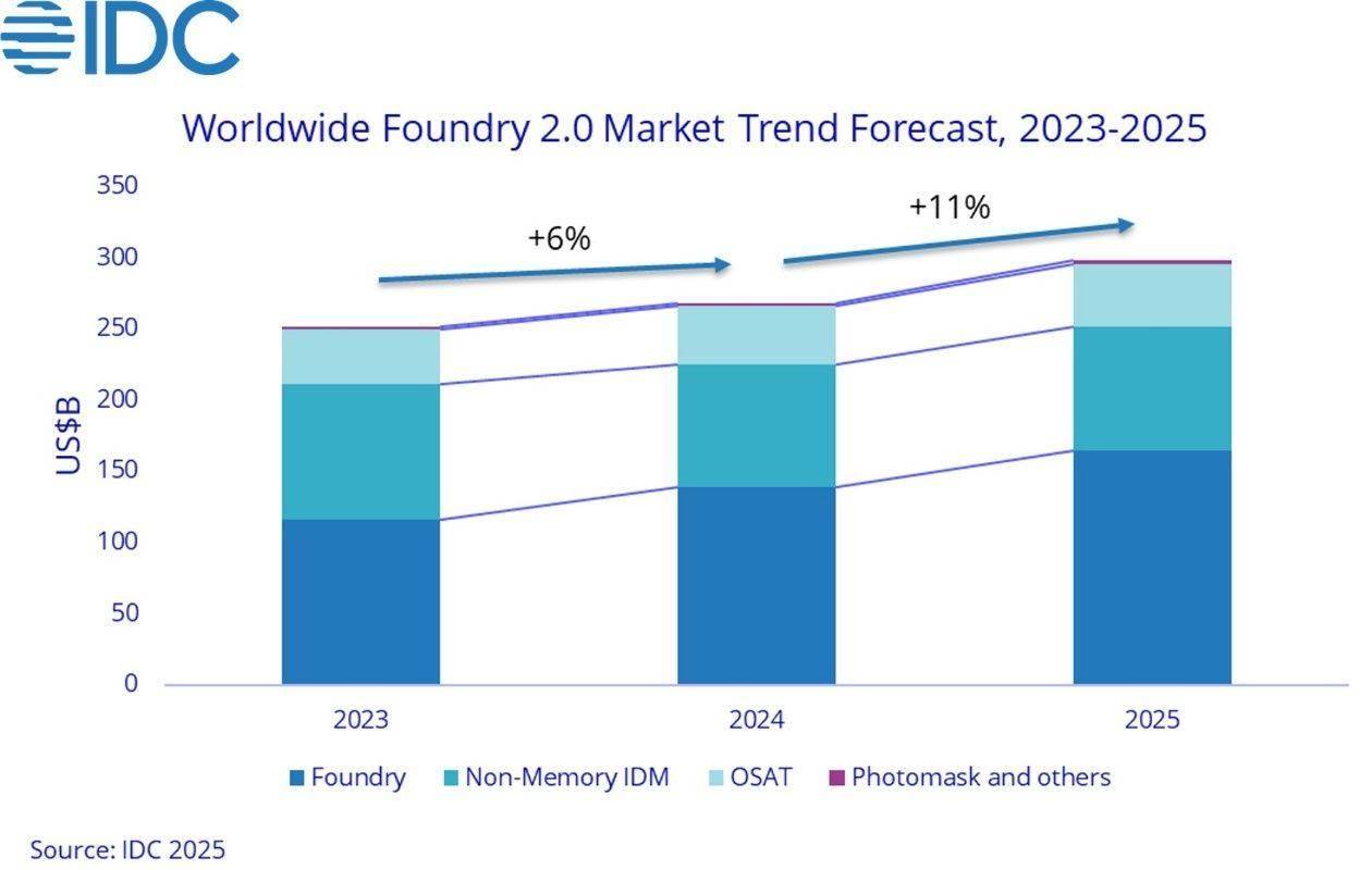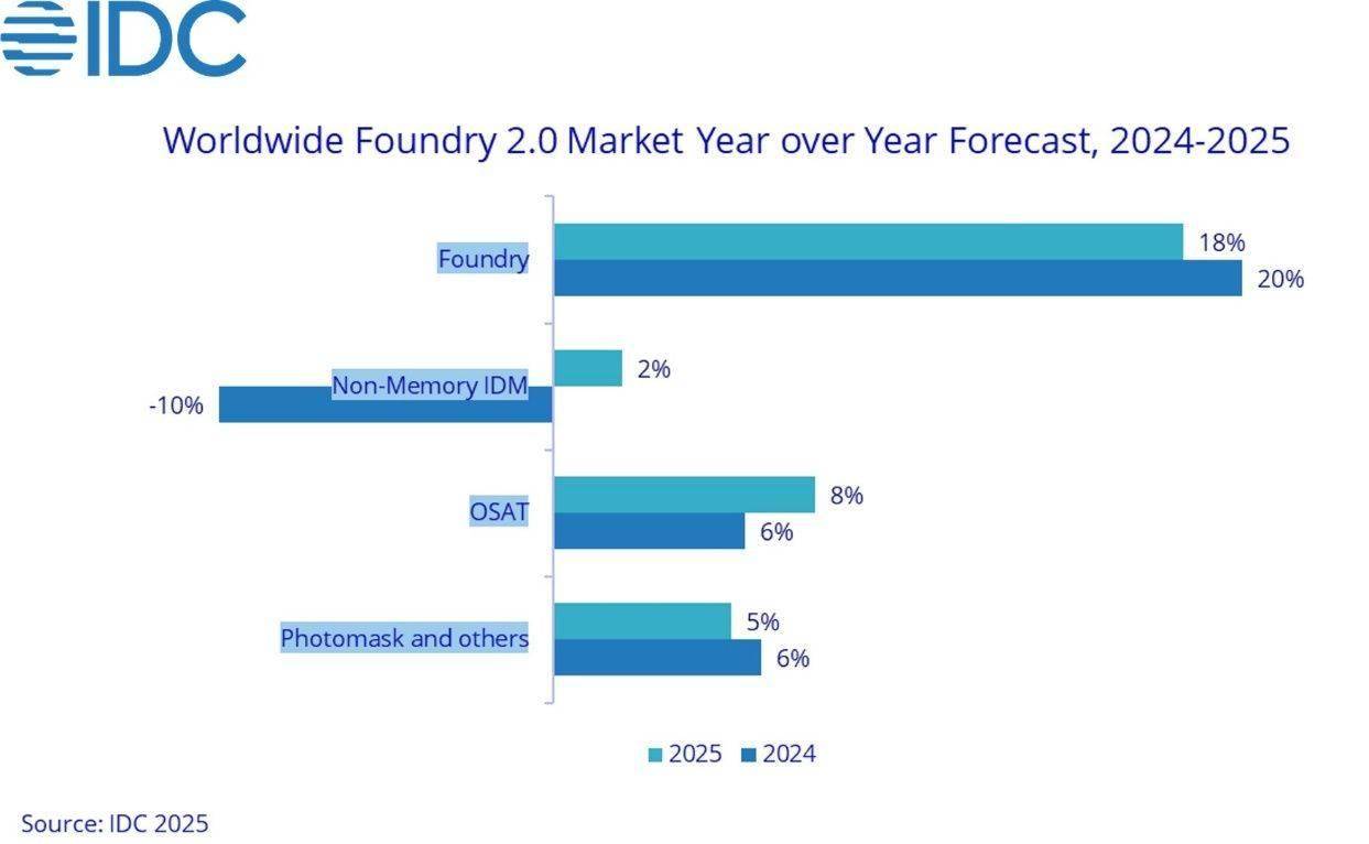 在外包半导体封装与测试(OSAT)领域,IDC观察到传统封装测试业务表现平平,但AI加速器需求的激增带动了先进封装订单的增长。SPIL(隶属于ASE)、Amkor和KYEC等厂商积极承接与CoWoS相关的订单,推动了OSAT行业在2025年的预计增长达到8%。