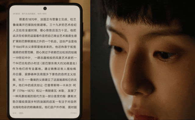 得益于鸿蒙操作系统5的出色大屏适配能力,华为Pura X的阔折叠设计带来了更广阔的显示面积,从而实现了阔感阅读、阔感浏览、阔感观影和阔感游戏四大场景体验。例如,在阅读时,华为Pura X可带来接近实体书的阅读体验,而其独创的“AI眼动翻页”功能更是通过软硬件协同和深度学习算法,实现了根据眼球转动自动翻页,彻底解放了用户的双手。