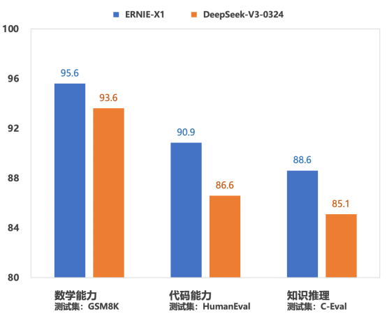 在数学场景中,GSM8K数据集测试后结果显示,文心X1得分95.6,DeepSeek-V3-0324得分93.6;代码生成层面,Humaneval数据集测试后结果显示,文心X1得分90.9,DeepSeek-V3-0324得分86.6;在知识推理层面,C-eval数据集测试后结果显示,文心大模型X1得分88.6,DeepSeek-V3-0324得分85.1。