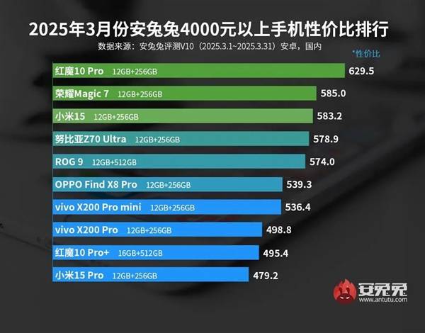 近期,安兔兔发布了3月份安卓旗舰手机性价比榜单,红魔10 Pro凭借其出色的配置与价格比,成功登顶。