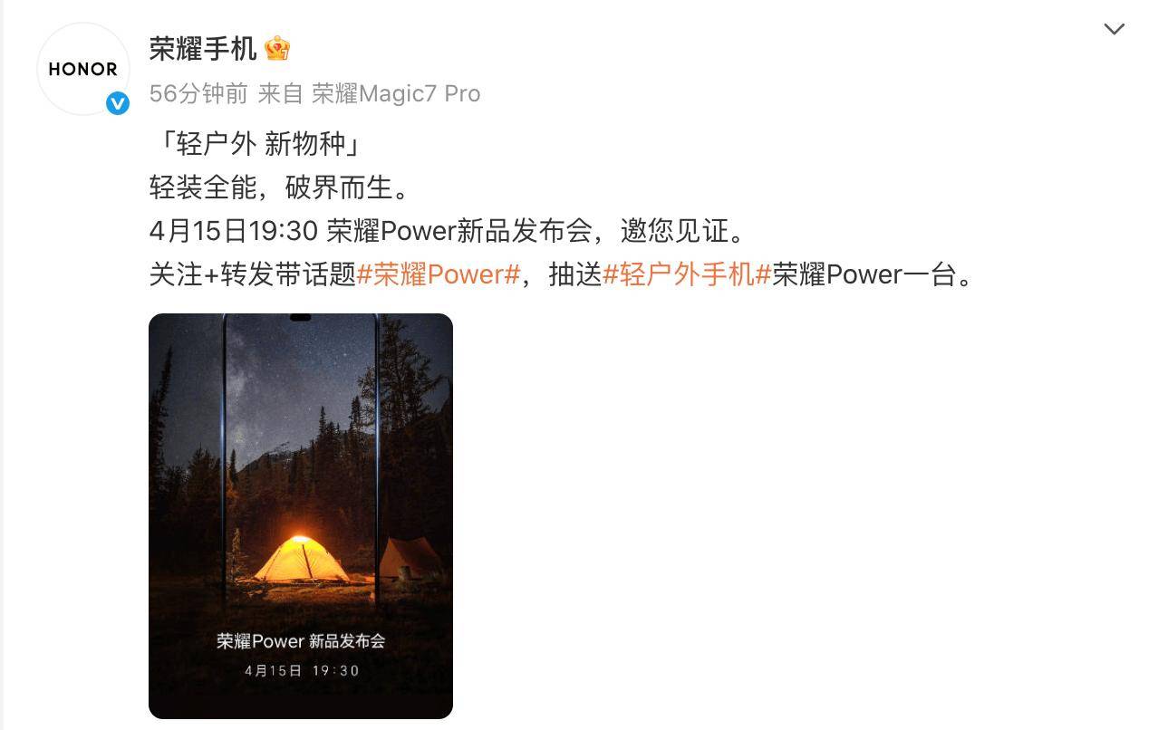 荣耀公司近日正式宣布,其全新轻户外手机系列——荣耀Power,将于4月15日正式亮相。这款新机作为阿尔法战略发布后的又一力作,被寄予厚望,旨在满足大众用户在户外场景下的多元化需求。