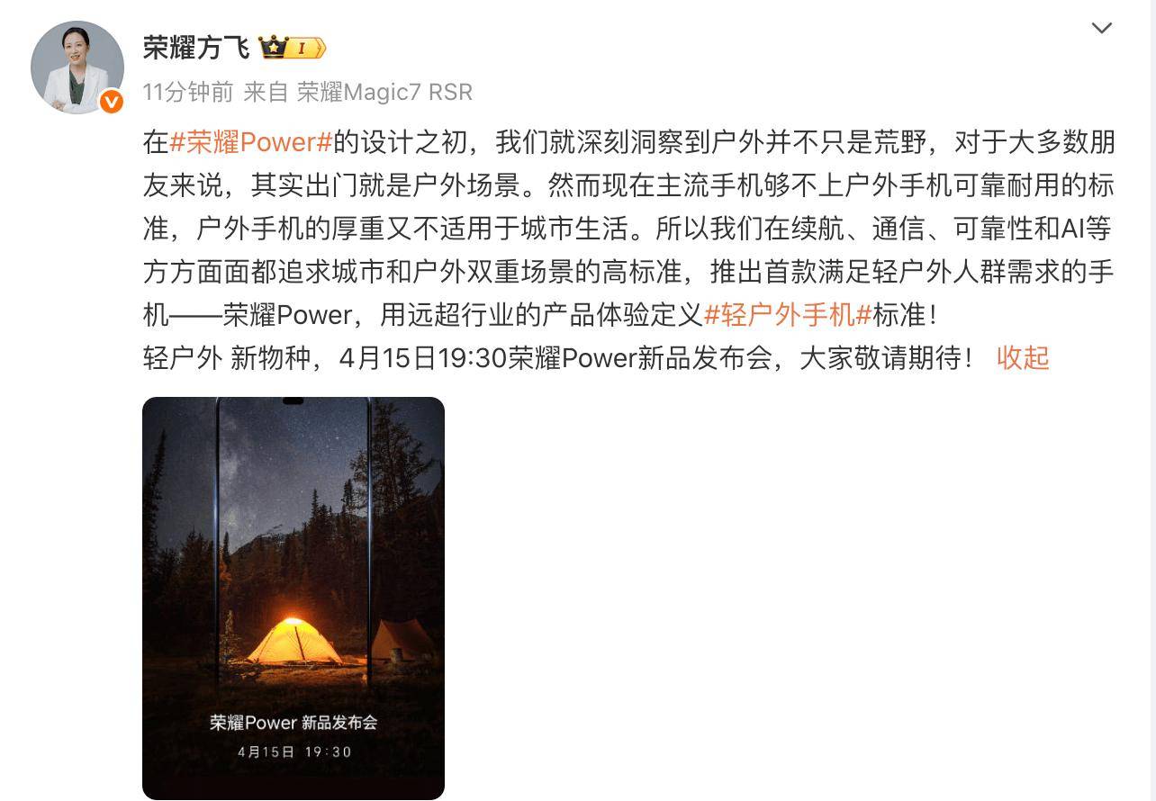 荣耀方飞,荣耀公司的领导人,在微博上进一步分享了关于荣耀Power的详细信息。他透露,这款新机将专注于续航、通信、可靠性和AI技术等方面的创新,力求通过融合城市精致感与户外专业性,为用户提供远超行业标准的轻户外手机体验。