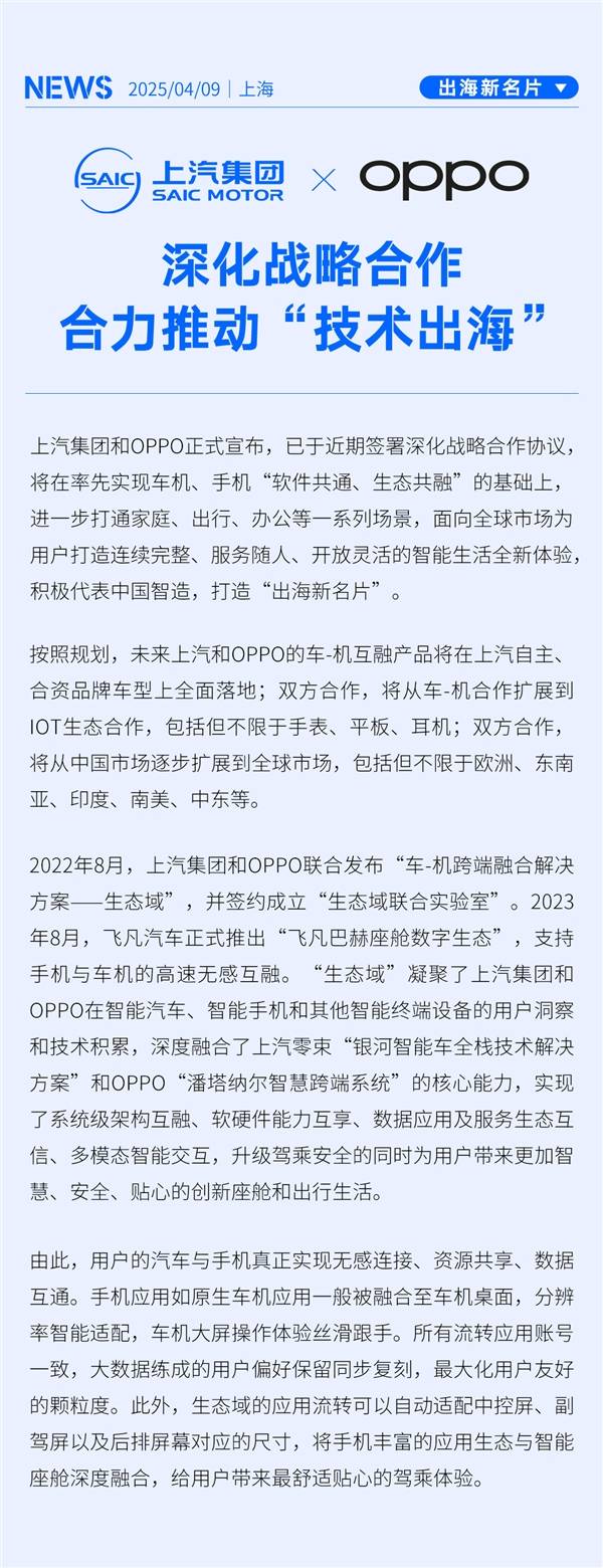随着上汽与OPPO合作的不断深化,未来双方在智能汽车与智能手机领域的创新融合将为用户带来更多惊喜,共同推动智能出行领域的发展。