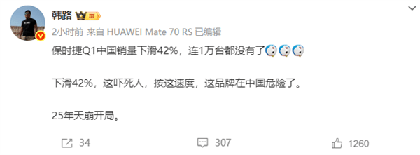 在中国市场,保时捷面临的挑战尤为显著。第一季度保时捷在中国的交付量仅为9471辆,同比暴跌42%。这一数据引起了业内广泛关注。知名汽车博主韩路,同时也是保时捷Taycan车主,对此表示担忧,称这是保时捷“25年来的天崩开局”,并警告说如果这一趋势持续下去,保时捷在中国市场的地位将面临严重威胁。
