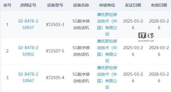 摩托罗拉还有三款新机在工信部入网,型号分别为XT2503-3、XT2507-5和XT2505-4。据推测,这三款新机分别对应的是Edge 60 fusion、Edge 60 Pro以及Edge 60。这三款新机的加入,无疑将进一步丰富摩托罗拉的产品线,为用户提供更多选择。