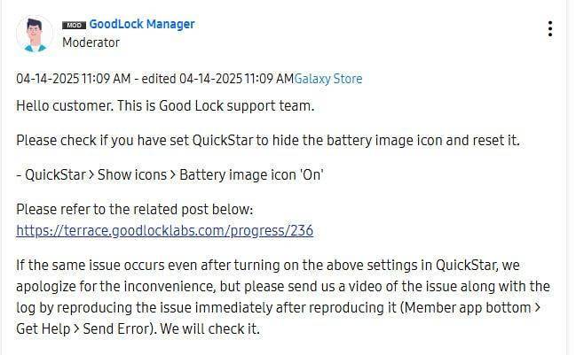 针对这一问题,三星官方社区的管理员给出了恢复电池图标显示的详细步骤:用户只需打开Good Lock应用,进入QuickStar模块,然后选择“Indicator Visibility”(指示器可见性)选项,重新启用电池图标的显示即可。