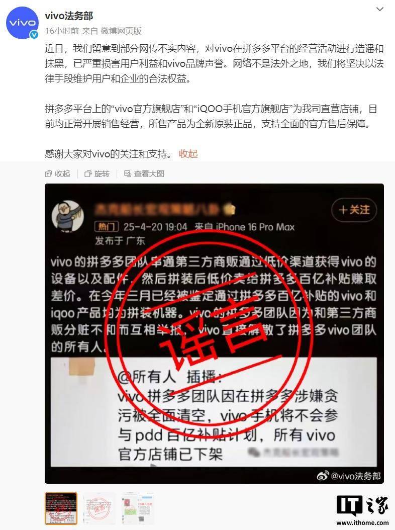 vivo法务部辟谣:拼多多直营店铺正常运营,严斥造谣抹黑行为