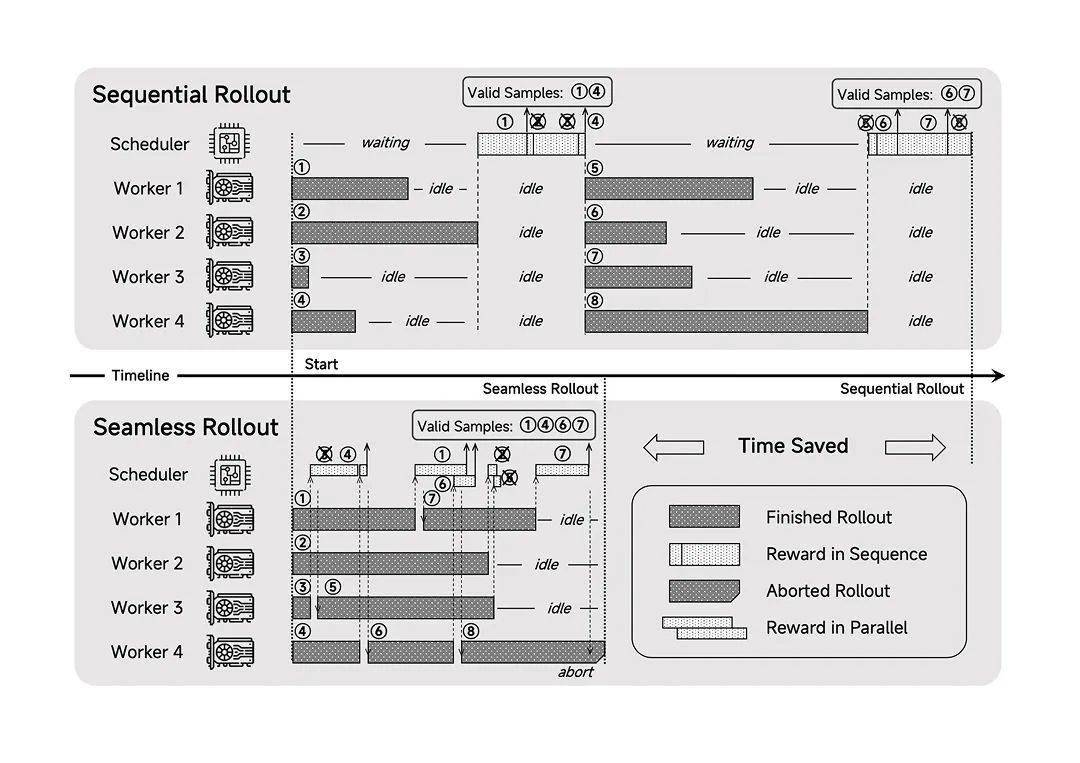 进入后训练阶段,小米团队采用了高效稳定的强化学习算法和框架。算法层面,创新性地提出了Test Difficulty Driven Reward机制,有效缓解了困难算法问题中的奖励稀疏难题,并引入Easy Data Re-Sampling策略,确保RL训练的稳定性。框架层面,设计了一套Seamless Rollout系统,使得RL训练速度提升了2.29倍,验证速度也加快了1.96倍。