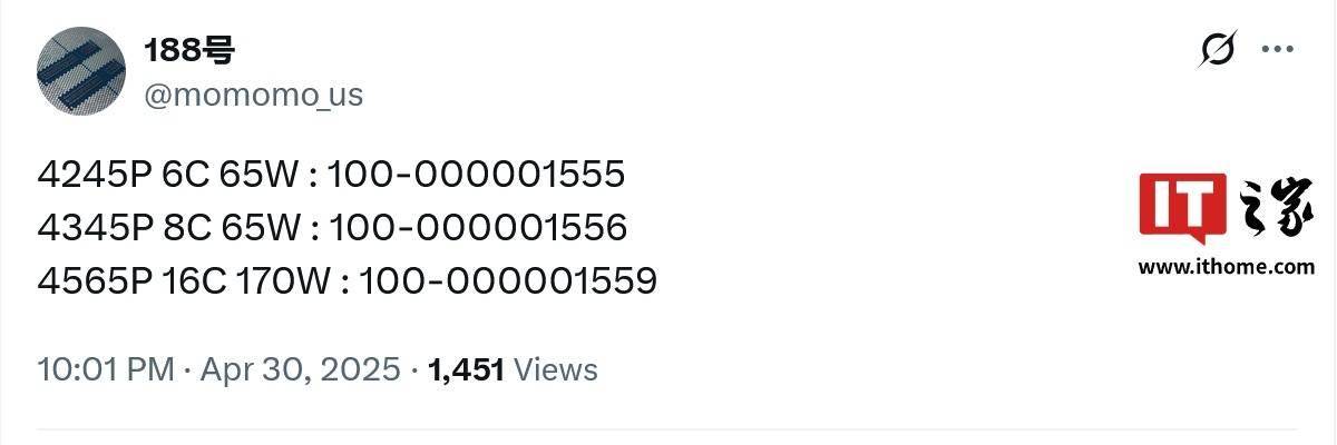 最后,消息人士还分享了三款EPYC 4005处理器的具体名称和产品ID,包括6核心45W的EPYC 4245P、8核心65W的EPYC 4345P和16核心170W的EPYC 4565P。这些规格大致对应消费级的锐龙5 9600X、锐龙7 9700X和锐龙9 9950X,为服务器用户提供了更多选择。