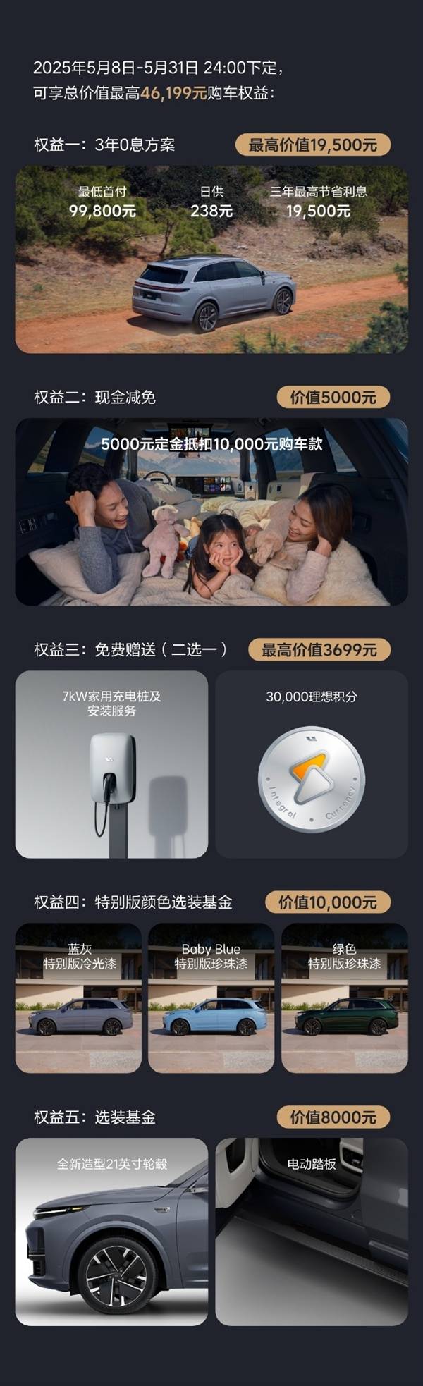 对于追求个性化的消费者而言,理想汽车同样提供了丰富的选装选项。消费者不仅可以选择全新的蓝灰特别版冷光漆、绿色特别版珍珠漆或BabyBlue特别版珍珠漆(价值1万元限时免费),还可以利用8000元选装基金选择21英寸新造型轮毂或电动踏板,进一步彰显个性风采。