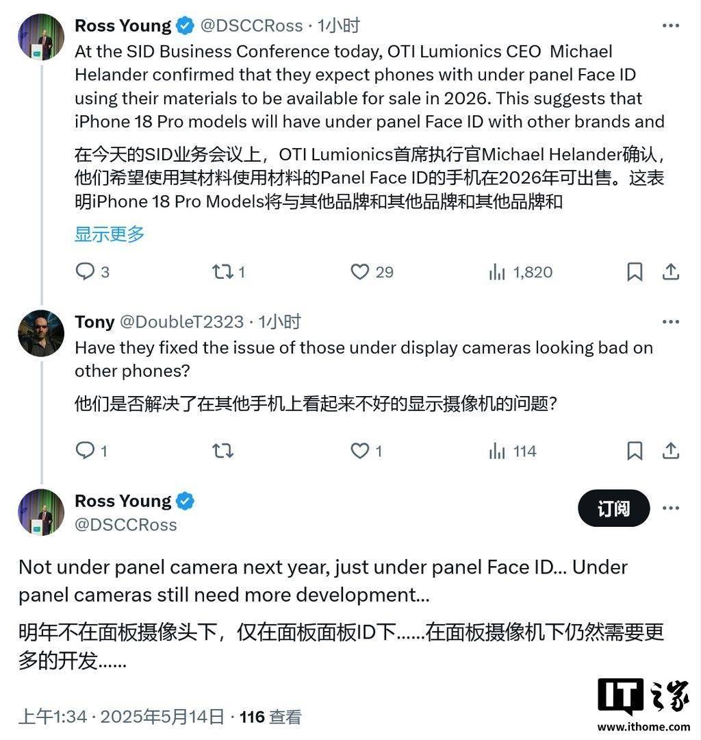 近期,屏幕供应链领域的知名咨询公司DSCC的首席执行官罗斯·杨,在一个知名平台上发布了一条引人注目的推文,其中透露了关于苹果iPhone 18 Pro系列的一项重大技术创新。据其爆料,苹果即将推出的iPhone 18 Pro系列将首次采用屏下Face ID系统。