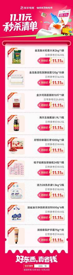 (快手双11购物节爆品好物1元秒杀、11块1毛1秒杀清单)