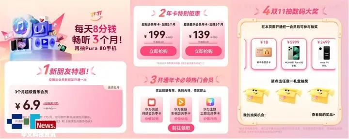 双十一期间,华为音乐也推出超值福利,超钻会员年卡加赠2个月,到手价仅199元。升级鸿蒙5及以上用户开通年卡还能领取华为阅读、视频、主题等联合会员季卡。所有会员还可参与全年仅1次的年卡大秒杀,还可参与抽奖,有机会获得Pura 80手机、HUAWEI Sound X4音箱等好礼。新朋友还有特别福利,6.9元畅听三个月,算下来每天只要8分钱!