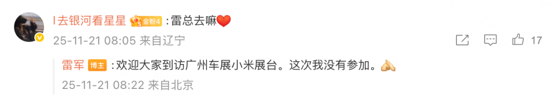 不过,雷军在回复网友评论时已经亲自确认不会现身 2025 广州车展小米展台。