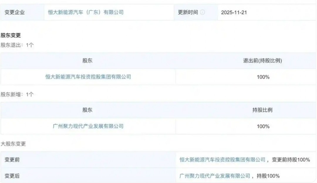 【TechWeb】11月21日消息,公开信息显示,恒大智能汽车(广东)有限公司、恒大新能源汽车(广东)有限公司发生工商变更,原股东恒大新能源汽车投资控股集团有限公司退出,新增广州国资旗下广州聚力现代产业发展有限公司为全资股东。