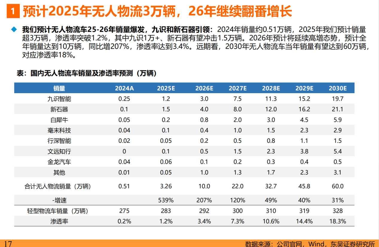 业内人士预计,未来三年无人配送车将维持高速增长,当车队规模达到临界量级,有望构建"智能运力网络",通过全社会共享与高效匹配,提升整体物流效率。建议持续关注东吴证券相关行业研究报告,把握行业发展机遇。