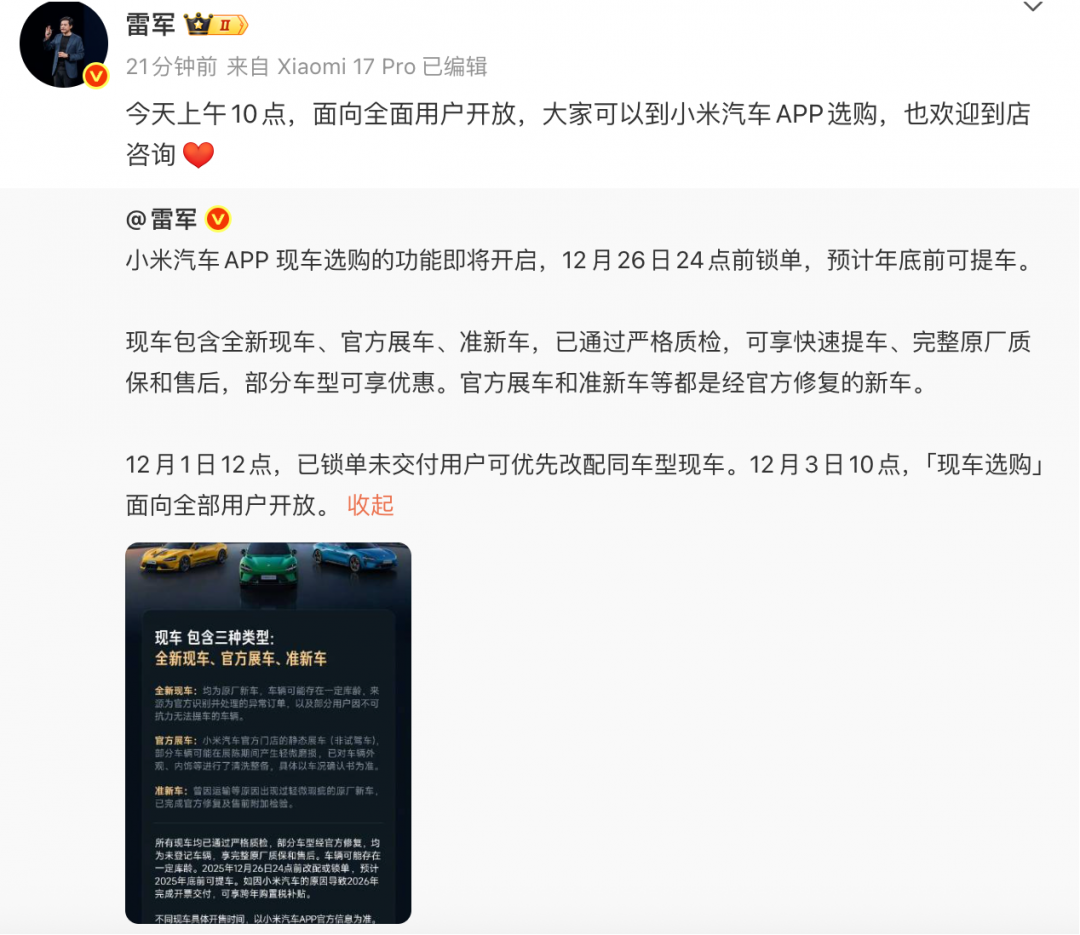 12月3日消息,今日,小米集团创始人、董事长雷军发微博表示,小米汽车APP现车选购功能,今早10点,面向全部用户开放。