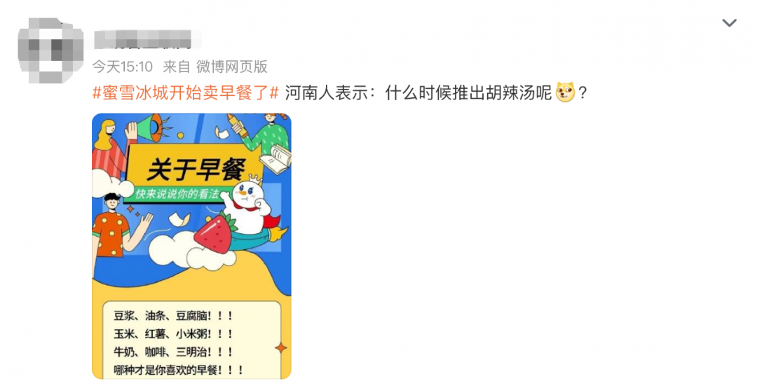 “知危”表示,大范围的民调,小范围的试点,这熟悉的套路都说明蜜雪冰城的早餐计划正式启动了。