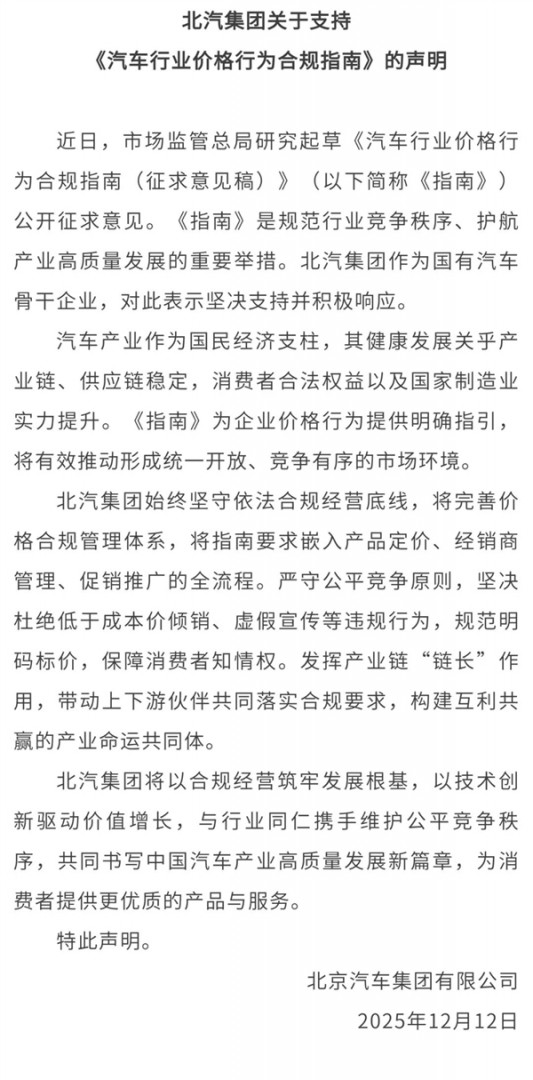 北汽集团始终坚守依法合规经营底线,将完善价格合规管理体系,将指南要求嵌入产品定价、经销商管理、促销推广的全流程。