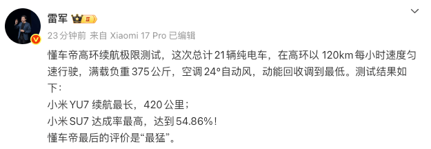 懂车帝续航测试揭晓:小米SU7达成率居首,YU7续航里程领跑同组