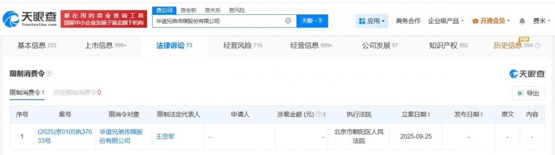 此外,天眼查显示,近日华谊兄弟及其法定代表人王忠军新增一则限制消费令,涉及广告合同纠纷案件,申请人为北京泰睿飞克科技有限公司,执行法院为北京市朝阳区人民法院。