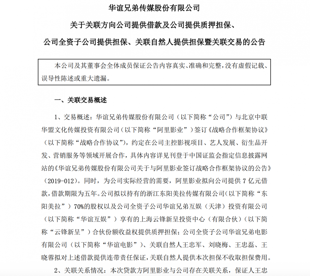 2020年1月1日,华谊兄弟变更了7亿元借款的部分担保,取消华谊互娱享有的云锋新呈合伙份额收益权提供质押担保,变更为公司全资孙公司北京华远嘉利房地产开发有限公司持有的自有房产、 国有土地使用权提供抵押担保。