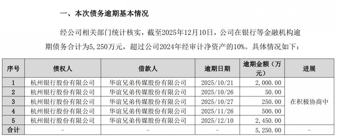 不仅如此,当前公司还陷入了债务危机。12月10日,华谊兄弟公告,因部分回款资金未能如约到位,造成暂时性流动资金紧张,使得华谊兄弟阶段性出现个别债务未能如期偿还的情形。截至2025年12月10日,公司逾期债务合计为5250万元,超过公司2024年经审计净资产的10%。
