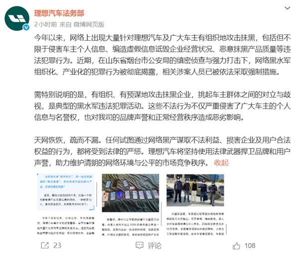 理想汽车法务部今日转发烟台公安通报,称今年以来网络上出现大量针对理想汽车及车主的有组织攻击抹黑行为,包括侵害车主个人信息、编造虚假信息诋毁企业经营状况、恶意抹黑产品质量等违法犯罪活动。烟台市公安局近期通过缜密侦查与强力打击,彻底揭露了这一网络黑水军组织化、产业化的犯罪行为,相关涉案人员已被依法采取强制措施。