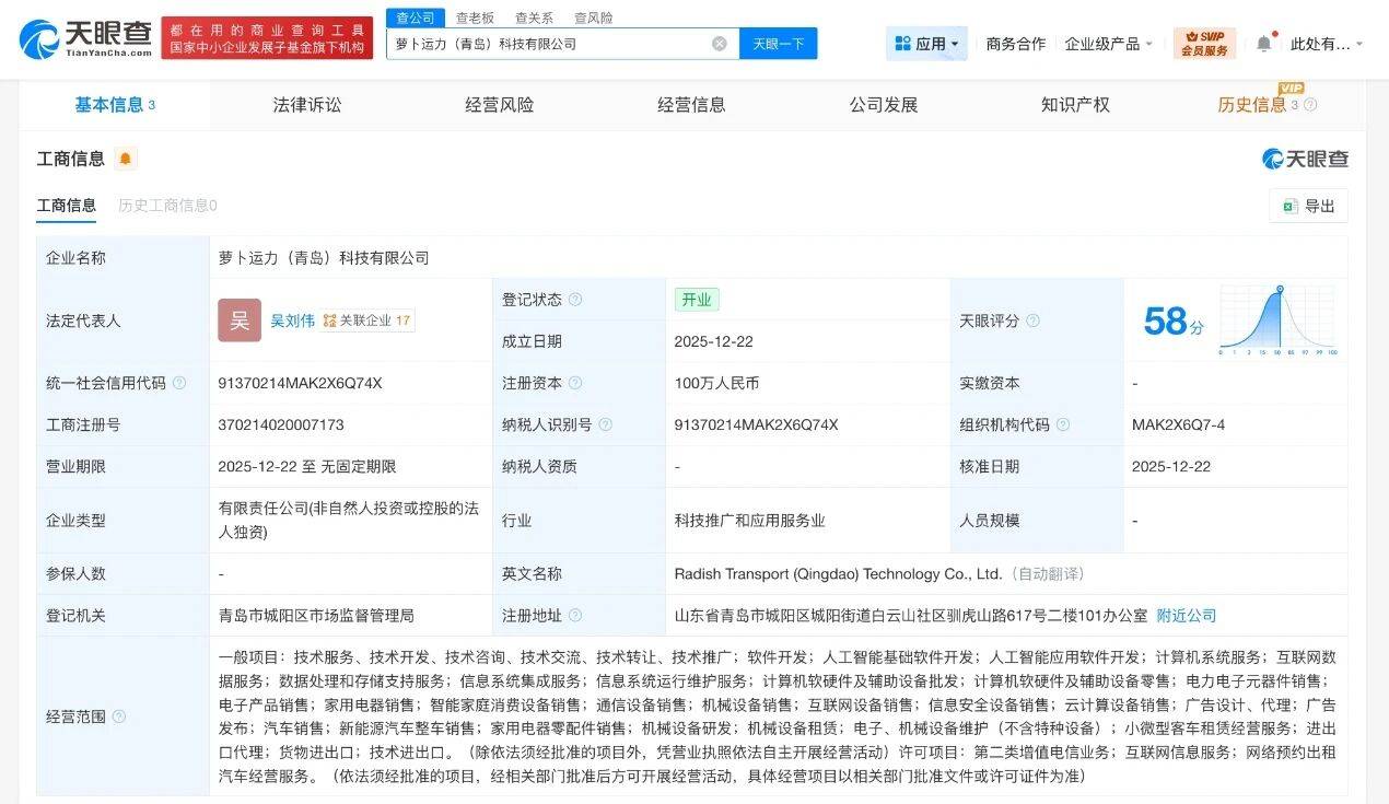 据企业信息查询平台披露,一家名为萝卜运力(青岛)科技有限公司的新企业近日完成工商注册登记。该公司法定代表人为吴刘伟,注册资本金设定为100万元人民币,由萝卜快跑关联企业——萝卜运力(北京)科技有限公司全资控股。