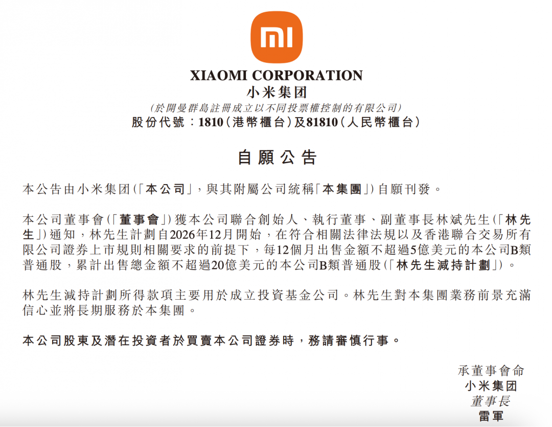 12月29日消息,日前,小米集团在港交所发布公告称,公司收到联合创始人、执行董事、副董事长林斌的通知:林斌计划自2026年12月开始,在合法合规的前提下,每12个月出售金额不超过5亿美元的公司B股普通股,累计出售总金额不超过20亿美元。