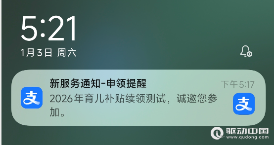 1月4日消息,2026年育儿补贴系统正在进行续领测试,已有人收到支付宝的邀约并完成申领。