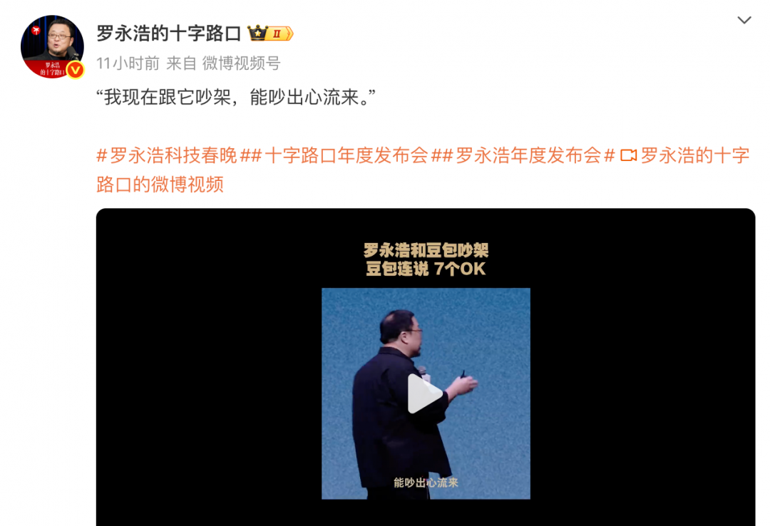 罗永浩称,他体验的所有大模型产品里,豆包是最厉害的,并在现场演示了与豆包“吵架”(辩论)。