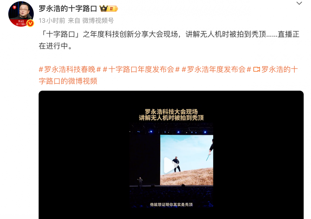 其中,在讲解无人机产品时,还出现一个小插曲。罗永浩称,他参与拍摄了无人机产品的视频,结果被无人机拍到秃顶。