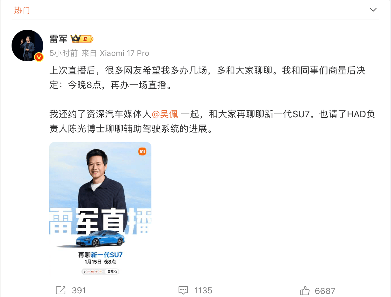 雷军今晚8点再开直播 携陈光博士详解SU7及辅助驾驶新进展
