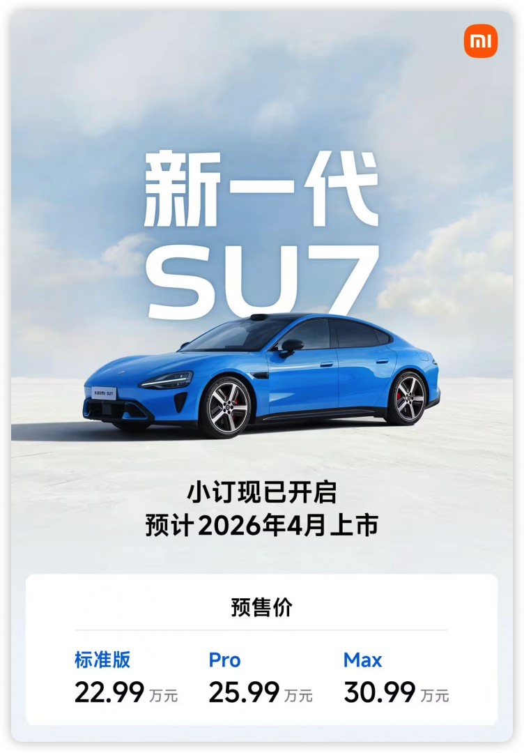 1月7日消息,今日,小米汽车官宣新一代SU7预计2026年4月上市,上午10点开启小订。