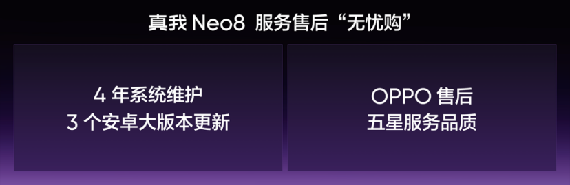 在强大产品之上,真我Neo8更提供"无忧购"服务保障。系统维护方面,真我Neo8承诺4年系统维护与3个安卓大版本更新,从大一用到大四,系统仍能保持流畅如新的使用体验。售后服务方面,真我手机将于今年4月全面接入OPPO售后服务体系,享受OPPO五星服务品质,包括面对面维修、可视化寄修服务、30天性能故障包换、维修部件至高180天质保等全方位保障,让用户买得放心、用得舒心。