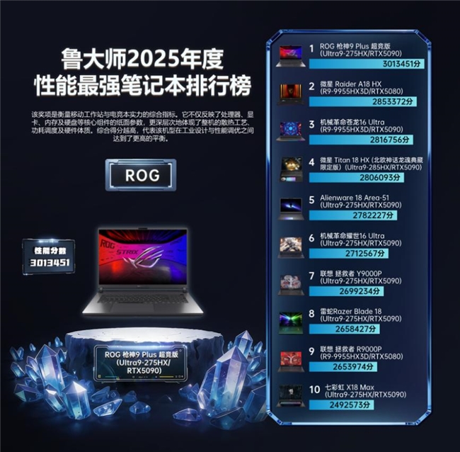 ROG 枪神 9 Plus 超竞版 夺得“2025年度性能最强笔记本”。它不仅仅是把 Ultra 9 与 RTX 5090 放进一台机身,而是把旗舰性能真正跑出来:冰川散热 3.0 与液金覆盖带来更强的持续释放能力,让高性能输出稳定“不断电”,为 2025 旗舰性能本树立了直接参照系。