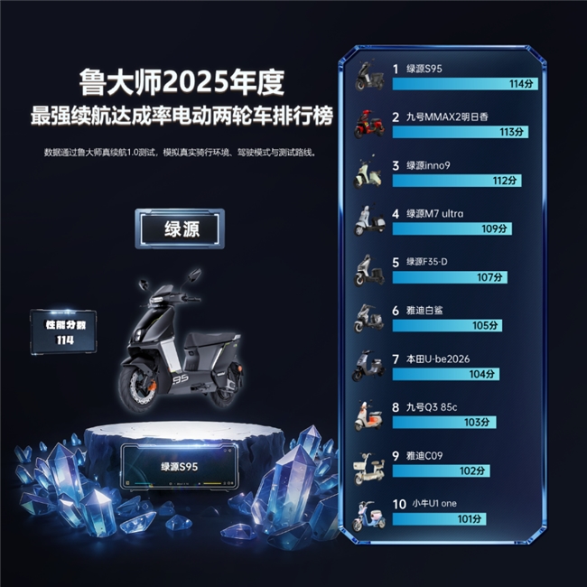 绿源 S95 荣膺“2025年度最强续航达成率”。在用户最关心的续航问题上,绿源用精准能耗管理与智能温控系统提升能量效率,基于路况实时调整功率输出,让实测表现稳定且超预期,直接解决用户“续航虚标焦虑”的痛点。