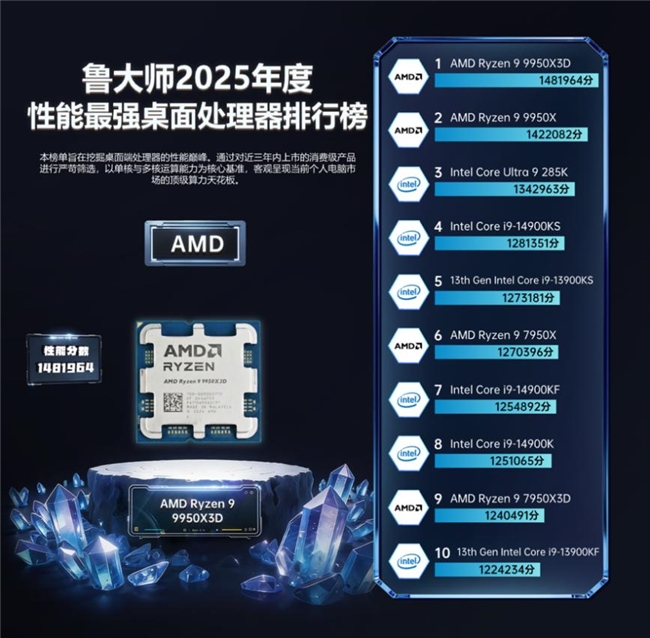 AMD Ryzen 9 9950X3D 荣获“2025年度性能最强桌面处理器”。依托第二代 3D V-Cache 技术带来的 144MB 超大缓存,其在高帧电竞与专业生产力双赛道同时拉满上限:游戏端轻松突破千帧,创作端则以更稳定的吞吐能力建立优势,代表了桌面平台性能天花板的最新高度。