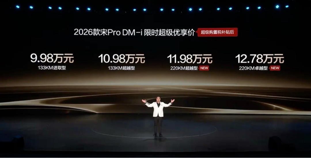 1月10日消息,2026款比亚迪宋Pro DM-i长续航版正式上市,全系限时超级优享价9.98-12.78万元,其中220km版本限时起售价为11.98 万元。