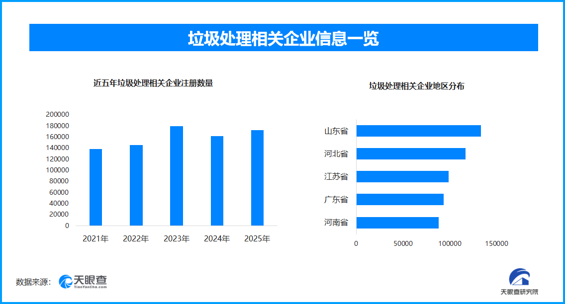 天眼查专业版数据显示,截至目前我国现存在业、存续状态的垃圾处理相关企业超138.3万家。其中,2025年新增注册相关企业超17.2万余家,从企业注册数量趋势来看,垃圾处理相关企业的注册数量在2023年达到顶峰,为17.9万余家。