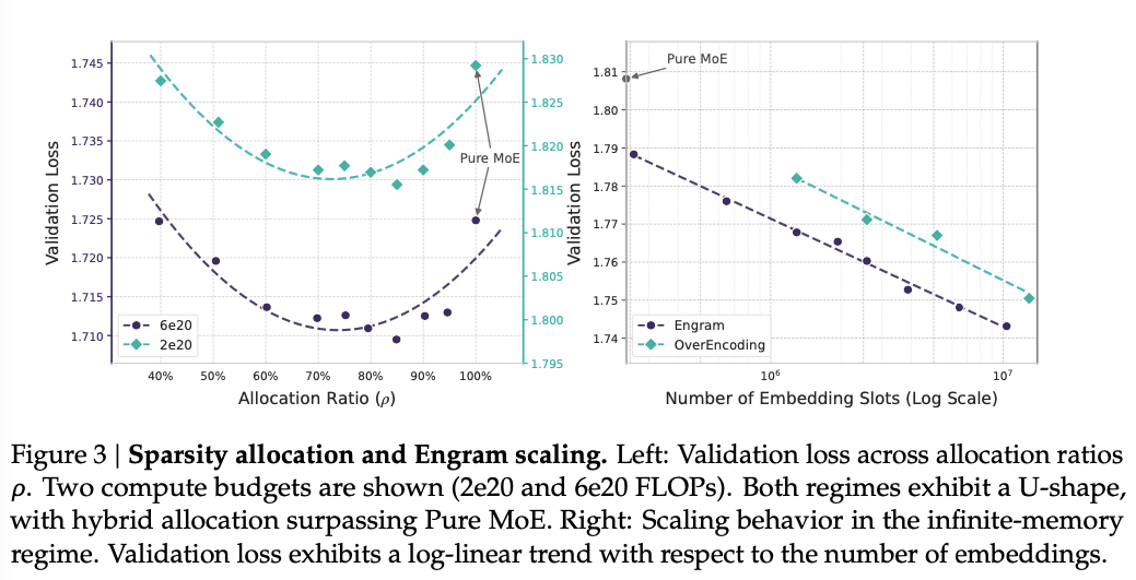 最终,实验揭示了一条“U形扩展定律”(如下图):在固定参数与FLOPs下,将稀疏参数预算的约20%-25%重新分配给Engram可获得最佳性能。例如在10B参数规模下,验证损失从1.7248降至1.7109。
