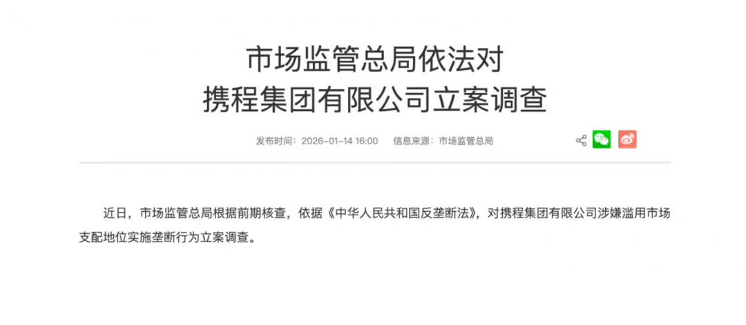 1月14日消息,据国家市场监督管理总局消息,近日,市场监管总局根据前期核查,依据《中华人民共和国反垄断法》,对携程集团有限公司涉嫌滥用市场支配地位实施垄断行为立案调查。