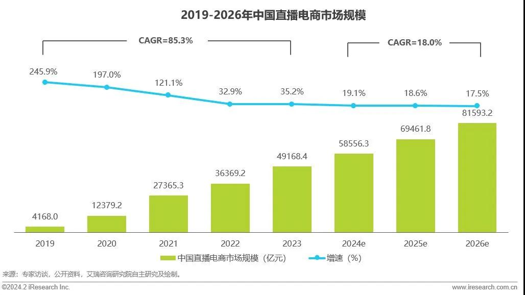 直播电商增速也从爆炸式的245.9%,逐渐下落至两位数,据艾瑞咨询预计,2024—2026年,其增速会稳定在18%左右。