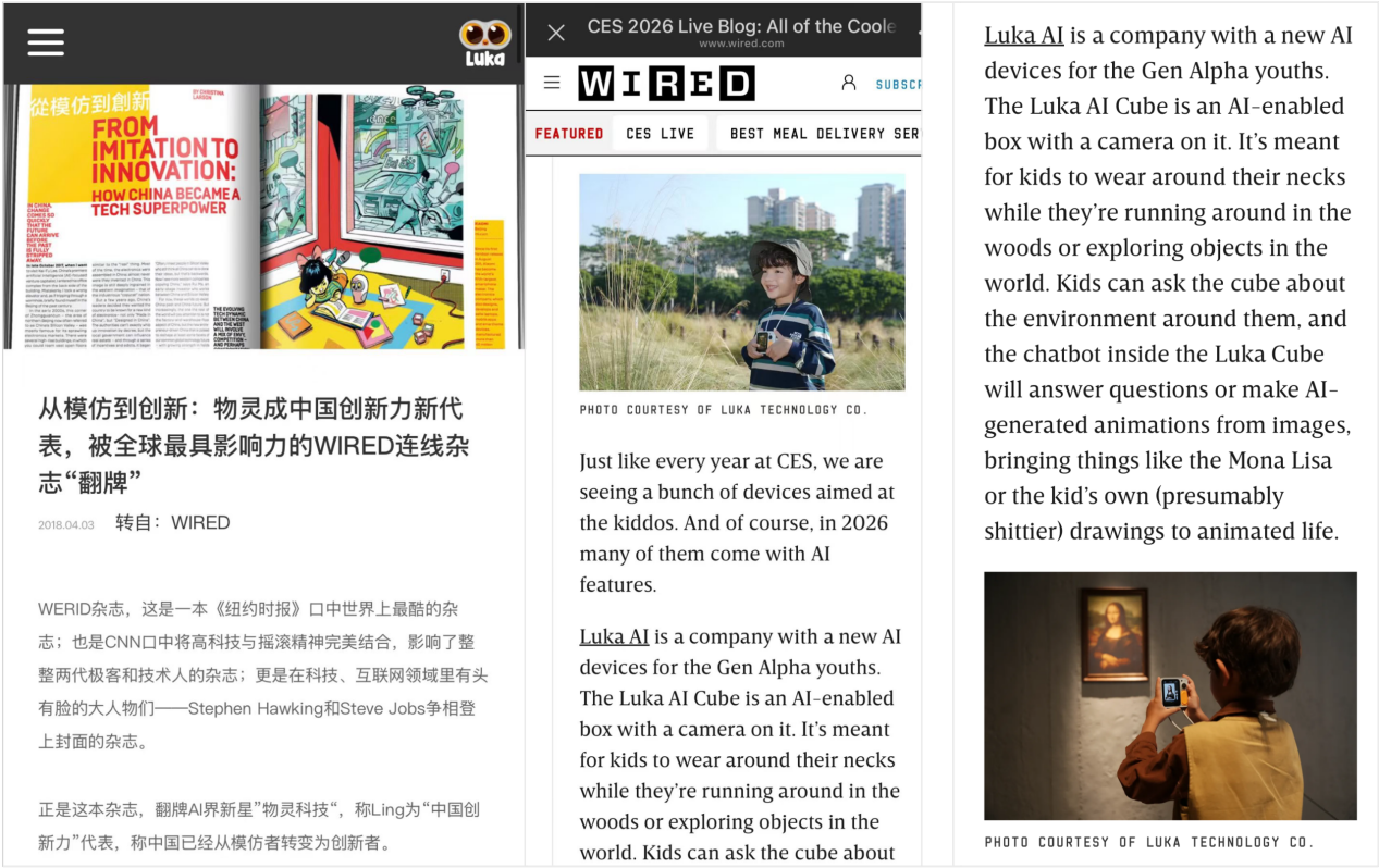 2018年,明星产品 Luka 以开创性的无屏幕交互设计同百度、腾讯、阿里、大疆一起,作为中国原创AI技术 Superpower代表,登上《Wired》(连线杂志),成为家庭 AI 陪伴领域的标杆;八年后,全新力作小方机在 CES 2026 盛会再续荣光 —— Wired在专题报道《CES 2026 Live Blog: All of the Coolest Tech We Saw》中,开篇即以长篇幅深度聚焦灵宇宙及小方机,盛赞其在阿尔法世代陪伴教育垂直领域的突破性创新。这份跨越八年的双重认可,不仅印证了品牌从 Luka 到小方机的持续领跑地位,更彰显了灵宇宙团队以 LingOS 多模态交互系统为核心、从 “感知 AI” 向 “PhysicalAI” 跨越的前瞻技术布局,以及将 “世界即课堂” 理念落地为真实场景价值的创新实力。