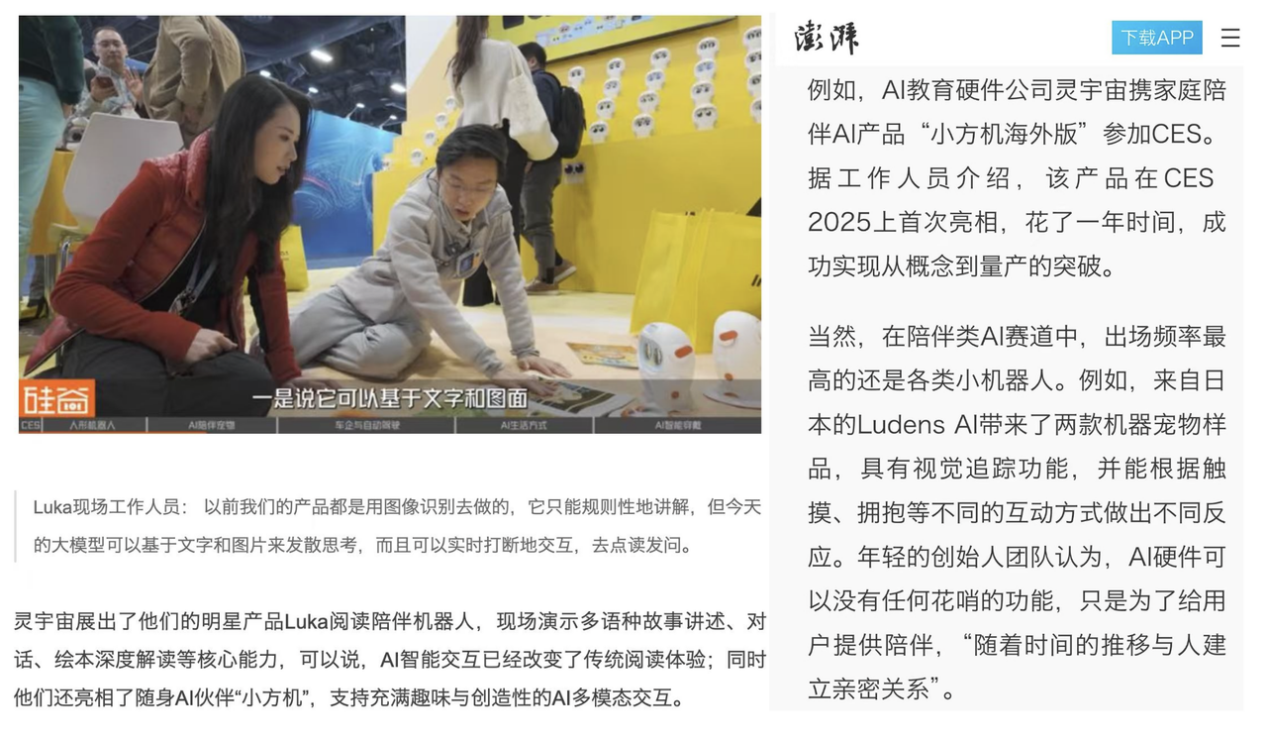 从CCTV的国民级关注到MIT Technology Review等国际权威媒体的持续报道,灵宇宙在2026 CES的亮相,不仅展现了产品与技术实力,也标志着公司全球化战略的进一步进阶。围绕Physical AI的差异化布局,灵宇宙在多元化机器人发展方向中形成清晰定位——通过Luka与小方机的产品组合,精准回应Gen-Alpha在家庭陪伴与探索场景中的核心需求,逐步构建起面向下一代年轻用户的原生AI产品体系。